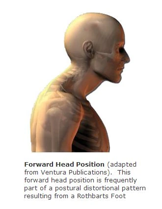 A forward head position is part of apostural distortional pattern caused by an abnormal embryological foot structure, now known as the Rothbarts Foot.