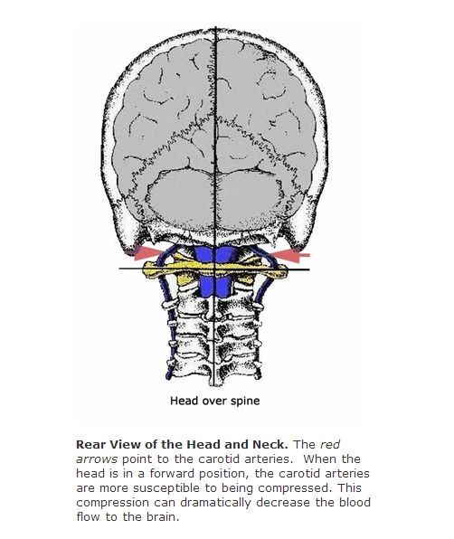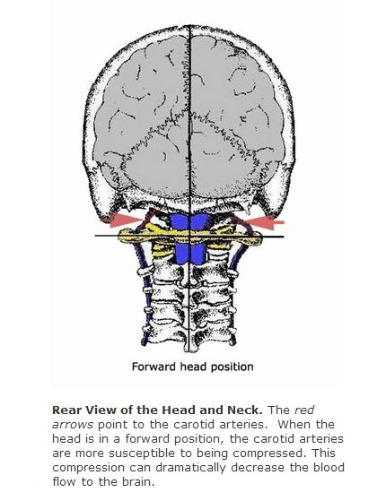 - when the head is forward over the spine, the brain may not be receiving sufficient blood flow and oxygen due to compression of the carotid arteries. If this compression is severe enough, it can result in cerebral ischemia (CNS dysfunction). Clinically what we see is disturbed sleeping patterns, increased anxiety and mental sluggishness.